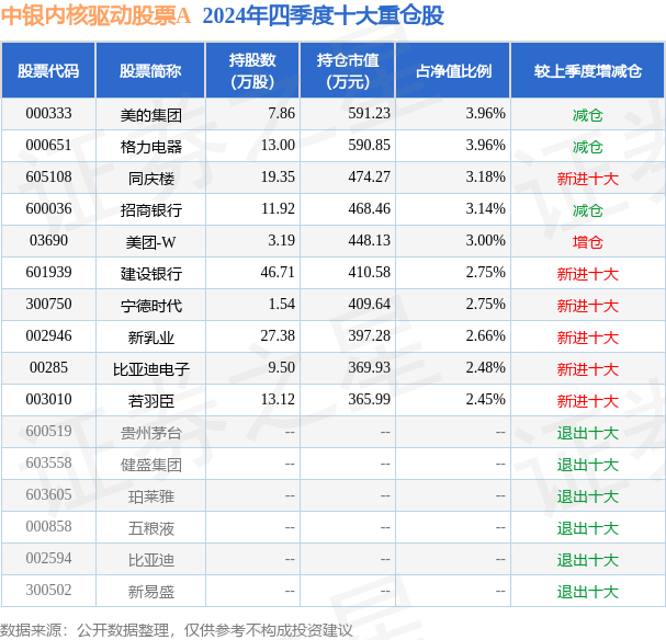 中银内核驱动股票A为股票型基金,根据最新一期基金季报显示,该基金资产配置:股票占净值比91.72%,债券占净值比5.84%,现金占净值比5.29%。基金十大重仓股如下: